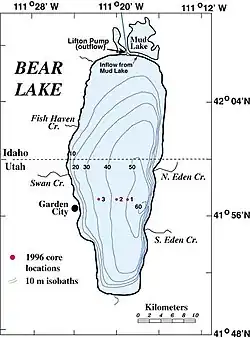 C'est est un lac naturel d'eau douce sur la frontière Idaho-Utah. D'une superficie d'environ 280 km2, il est divisé à peu près également entre les deux États. Le lac a été appelé Caraïbes des Rocheuses en raison de sa couleur bleu turquoise unique qui est due à la réfraction des dépôts de carbonate de calcium (calcaire) suspendus dans le lac[1]. Ses propriétés aquatiques ont mené à l'évolution de plusieurs espèces uniques de faune qui se reproduisent seulement dans le lac. Le lac Bear a plus de 250 000 ans d'existence.