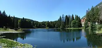 Dans la partie sud-est du lac, il y a un îlot avec des bois de mélèzes, de bouleaux et de sapins, tandis que les saules, les roseaux et les joncs abondent sur les rives. Là où l'eau est la plus basse, les nénuphars se développent, donnant au lac une apparence presque stagnustre. Ces dernières années, de nombreuses algues se sont également multipliées, contribuant à rendre le fond du lac marécageux et ses eaux partiellement troubles.
