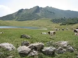 Le lac de roy depuis la rive sud-est. À l'arrière-plan, la pointe de Chalune (gauche) et le roc d'Enfer (droite). | |||