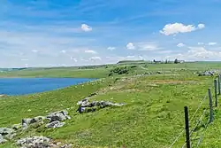 Deux ensembles néolithiques sont signalés dans les années 1950 et des observations plus récentes permettent de les retrouver. À l'est du lac, sur le promontoire, un bloc de basalte est interprété comme un menhir en raison de sa position (il était visible de loin même s'il est désormais couché) et de sa forme (sa base naturellement plate lui permet de tenir debout). Quelques dizaines de mètres plus à l'est, onze pierres dessinent un arc de cercle au centre duquel se trouve un petit tertre ; l'ensemble est manifestement une construction humaine, identifiée à un cromlech[12].