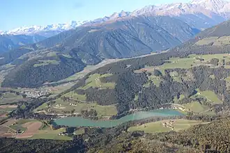 Le lac a une forme très allongée, mesurant 1 700 m de long et 400 m de large. Il occupe presque toute la vallée, à l'exception du chemin de fer Pusteria à l'ouest, et de la piste cyclable à l'est.