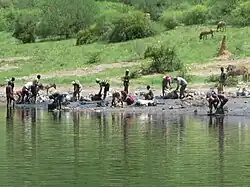 Pendant des siècles, les hommes plongent dans le lac pour récolter le sel et le vendent à travers l'Éthiopie, la Somalie et le Kenya. Il faut 1 heure pour descendre le sentier étroit de 2,5 km, du village au lac 340 mètres de descente. Chaque mineur y travaille comme indépendant de toute entreprise ou patron; pour gagner leur vie[4],[5].