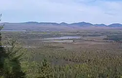 Le Lac des Joncs recouvert de glace, à l'avant plan, entouré du marais également gelé. La partie non gelée à l'arrière est le Lac Mégantic. (vue depuis le Chemin Louise-Bocage). | |