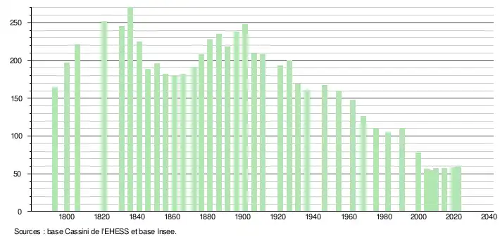 L'évolution du nombre d'habitants est connue à travers les recensements de la population effectués dans la commune depuis 1793. Pour les communes de moins de 10 000 habitants, une enquête de recensement portant sur toute la population est réalisée tous les cinq ans, les populations de référence des années intermédiaires étant quant à elles estimées par interpolation ou extrapolation[14]. Pour la commune, le premier recensement exhaustif entrant dans le cadre du nouveau dispositif a été réalisé en 2004[15].