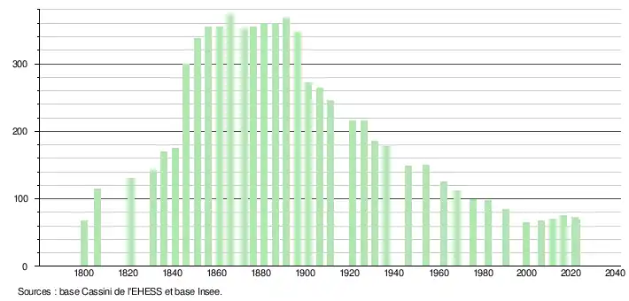 | L'évolution du nombre d'habitants est connue à travers les recensements de la population effectués dans la commune depuis 1800. Pour les communes de moins de 10 000 habitants, une enquête de recensement portant sur toute la population est réalisée tous les cinq ans, les populations de référence des années intermédiaires étant quant à elles estimées par interpolation ou extrapolation[26]. Pour la commune, le premier recensement exhaustif entrant dans le cadre du nouveau dispositif a été réalisé en 2006[27]. En 2022, la commune comptait 69 habitants[Note 7], en évolution de −8 % par rapport à 2016 (Tarn : +2,52 %, France hors Mayotte : +2,11 %). |