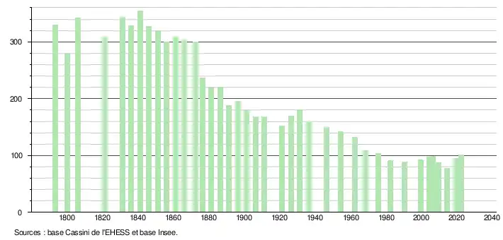 L'évolution du nombre d'habitants est connue à travers les recensements de la population effectués dans la commune depuis 1793. Pour les communes de moins de 10 000 habitants, une enquête de recensement portant sur toute la population est réalisée tous les cinq ans, les populations de référence des années intermédiaires étant quant à elles estimées par interpolation ou extrapolation[23]. Pour la commune, le premier recensement exhaustif entrant dans le cadre du nouveau dispositif a été réalisé en 2004[24].