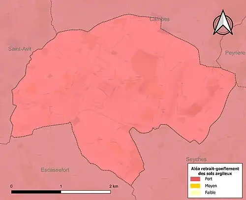 Le retrait-gonflement des sols argileux est susceptible d'engendrer des dommages importants aux bâtiments en cas d’alternance de périodes de sécheresse et de pluie[18]. La totalité de la commune est en aléa moyen ou fort (91,8 % au niveau départemental et 48,5 % au niveau national)[Carte 2]. Depuis le , en application de la loi ELAN, différentes contraintes s'imposent aux vendeurs, maîtres d'ouvrages ou constructeurs de biens situés dans une zone classée en aléa moyen ou fort[Note 2],[19].