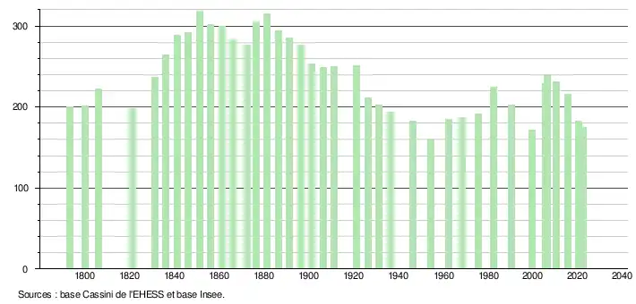- ↑ Fiches Insee - Populations de référence de la commune pour les années 2006, 2007, 2008, 2009, 2010, 2011, 2012, 2013, 2014, 2015, 2016, 2017, 2018, 2019, 2020, 2021 et 2022.