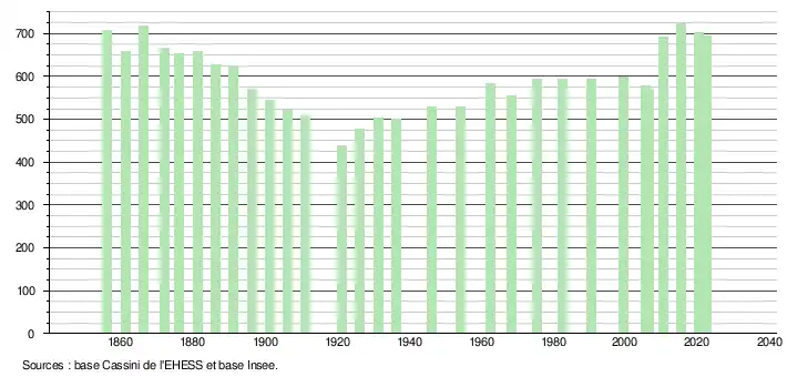 L'évolution du nombre d'habitants est connue à travers les recensements de la population effectués dans la commune depuis 1856. Pour les communes de moins de 10 000 habitants, une enquête de recensement portant sur toute la population est réalisée tous les cinq ans, les populations de référence des années intermédiaires étant quant à elles estimées par interpolation ou extrapolation[25]. Pour la commune, le premier recensement exhaustif entrant dans le cadre du nouveau dispositif a été réalisé en 2005[26].