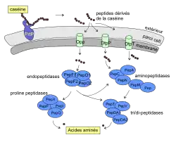 La protéase de paroi PrtP, fixée à l'extérieur de la cellule, est une enzyme à sérine qui hydrolyse les caséines en oligopeptides. Ceux-ci sont ensuite transportés à l'intérieur de la cellule par trois transporteurs. Les peptides sont alors hydrolysés par plusieurs peptidases[22] en acides aminés. En 2008, il y avait 41 peptidases connues ou potentielles chez L. lactis enregistrées dans les bases de données comme NCBI. Les peptides sont cassés de diverses manières par ces différentes peptidases.
