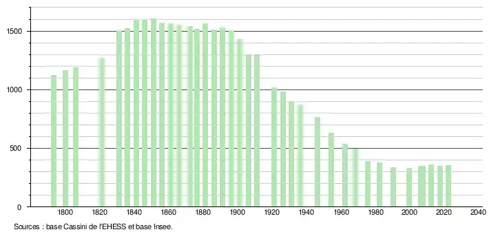 L'évolution du nombre d'habitants est connue à travers les recensements de la population effectués dans la commune depuis 1793. Pour les communes de moins de 10 000 habitants, une enquête de recensement portant sur toute la population est réalisée tous les cinq ans, les populations de référence des années intermédiaires étant quant à elles estimées par interpolation ou extrapolation[31]. Pour la commune, le premier recensement exhaustif entrant dans le cadre du nouveau dispositif a été réalisé en 2007[32].