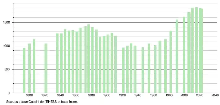 L'évolution du nombre d'habitants est connue à travers les recensements de la population effectués dans la commune depuis 1793. Pour les communes de moins de 10 000 habitants, une enquête de recensement portant sur toute la population est réalisée tous les cinq ans, les populations de référence des années intermédiaires étant quant à elles estimées par interpolation ou extrapolation[13]. Pour la commune, le premier recensement exhaustif entrant dans le cadre du nouveau dispositif a été réalisé en 2005[14].