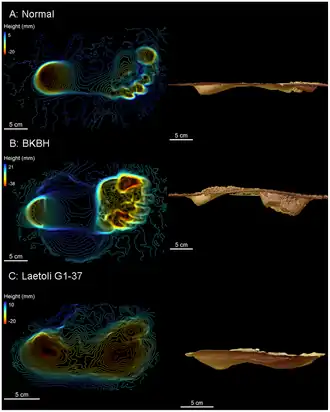 - 1 2 (en) Robin Crompton et al., « Human-like external function of the foot, and fully upright gait, confirmed in the 3.66 million year old Laetoli hominin footprints by topographic statistics, experimental footprint-formation and computer simulation », Journal of the Royal Society, (lire en ligne)