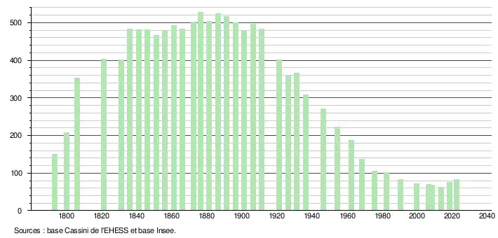 L'évolution du nombre d'habitants est connue à travers les recensements de la population effectués dans la commune depuis 1793. Pour les communes de moins de 10 000 habitants, une enquête de recensement portant sur toute la population est réalisée tous les cinq ans, les populations de référence des années intermédiaires étant quant à elles estimées par interpolation ou extrapolation[21]. Pour la commune, le premier recensement exhaustif entrant dans le cadre du nouveau dispositif a été réalisé en 2008[22].