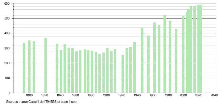 L'évolution du nombre d'habitants est connue à travers les recensements de la population effectués dans la commune depuis 1793. Pour les communes de moins de 10 000 habitants, une enquête de recensement portant sur toute la population est réalisée tous les cinq ans, les populations de référence des années intermédiaires étant quant à elles estimées par interpolation ou extrapolation[11]. Pour la commune, le premier recensement exhaustif entrant dans le cadre du nouveau dispositif a été réalisé en 2004[12].