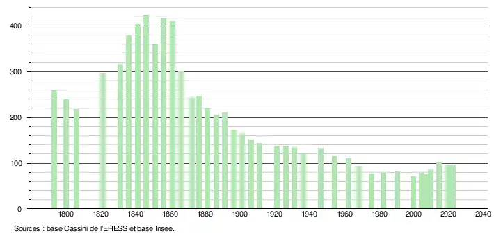 L'évolution du nombre d'habitants est connue à travers les recensements de la population effectués dans la commune depuis 1793. Pour les communes de moins de 10 000 habitants, une enquête de recensement portant sur toute la population est réalisée tous les cinq ans, les populations de référence des années intermédiaires étant quant à elles estimées par interpolation ou extrapolation[30]. Pour la commune, le premier recensement exhaustif entrant dans le cadre du nouveau dispositif a été réalisé en 2004[31].