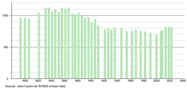 L'évolution du nombre d'habitants est connue à travers les recensements de la population effectués dans la commune depuis 1793. Pour les communes de moins de 10 000 habitants, une enquête de recensement portant sur toute la population est réalisée tous les cinq ans, les populations de référence des années intermédiaires étant quant à elles estimées par interpolation ou extrapolation[26]. Pour la commune, le premier recensement exhaustif entrant dans le cadre du nouveau dispositif a été réalisé en 2008[27].