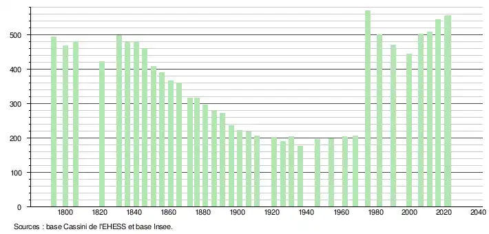 L'évolution du nombre d'habitants est connue à travers les recensements de la population effectués dans la commune depuis 1793. Pour les communes de moins de 10 000 habitants, une enquête de recensement portant sur toute la population est réalisée tous les cinq ans, les populations de référence des années intermédiaires étant quant à elles estimées par interpolation ou extrapolation[33]. Pour la commune, le premier recensement exhaustif entrant dans le cadre du nouveau dispositif a été réalisé en 2006[34].