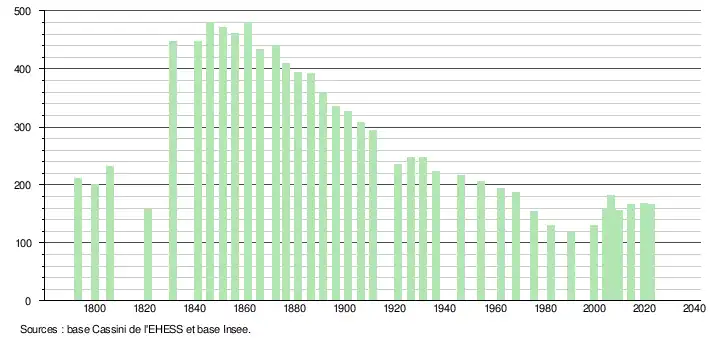 | L'évolution du nombre d'habitants est connue à travers les recensements de la population effectués dans la commune depuis 1793. Pour les communes de moins de 10 000 habitants, une enquête de recensement portant sur toute la population est réalisée tous les cinq ans, les populations de référence des années intermédiaires étant quant à elles estimées par interpolation ou extrapolation[23]. Pour la commune, le premier recensement exhaustif entrant dans le cadre du nouveau dispositif a été réalisé en 2004[24]. En 2022, la commune comptait 167 habitants[Note 3], en évolution de +3,09 % par rapport à 2016 (Gers : +1,04 %, France hors Mayotte : +2,11 %). |