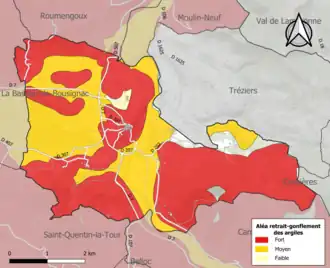 Les mouvements de terrains susceptibles de se produire sur la commune sont soit des chutes de blocs, soit des glissements de terrains, soit des mouvements liés au retrait-gonflement des argiles. Près de 50 % de la superficie du département est concernée par l'aléa retrait-gonflement des argiles, dont la commune de Lagarde[43]. L'inventaire national des cavités souterraines permet par ailleurs de localiser celles situées sur la commune[44].