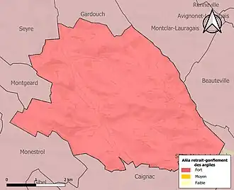 Le retrait-gonflement des sols argileux est susceptible d'engendrer des dommages importants aux bâtiments en cas d’alternance de périodes de sécheresse et de pluie. La totalité de la commune est en aléa moyen ou fort (88,8 % au niveau départemental et 48,5 % au niveau national). Sur les 177 bâtiments dénombrés sur la commune en 2019, 177 sont en aléa moyen ou fort, soit 100 %, à comparer aux 98 % au niveau départemental et 54 % au niveau national. Une cartographie de l'exposition du territoire national au retrait gonflement des sols argileux est disponible sur le site du BRGM[23],[Carte 3].