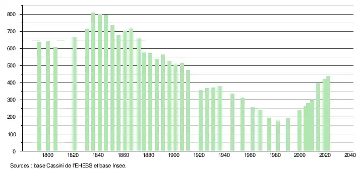L'évolution du nombre d'habitants est connue à travers les recensements de la population effectués dans la commune depuis 1793. Pour les communes de moins de 10 000 habitants, une enquête de recensement portant sur toute la population est réalisée tous les cinq ans, les populations de référence des années intermédiaires étant quant à elles estimées par interpolation ou extrapolation[27]. Pour la commune, le premier recensement exhaustif entrant dans le cadre du nouveau dispositif a été réalisé en 2004[28].