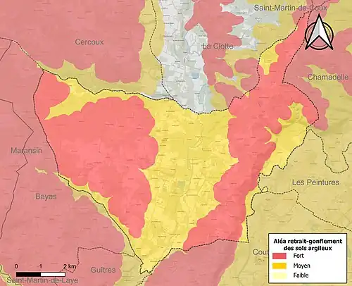 Le retrait-gonflement des sols argileux est susceptible d'engendrer des dommages importants aux bâtiments en cas d’alternance de périodes de sécheresse et de pluie. 99,9 % de la superficie communale est en aléa moyen ou fort (67,4 % au niveau départemental et 48,5 % au niveau national). Sur les 754 bâtiments dénombrés sur la commune en 2019, 753 sont en aléa moyen ou fort, soit 100 %, à comparer aux 84 % au niveau départemental et 54 % au niveau national. Une cartographie de l'exposition du territoire national au retrait gonflement des sols argileux est disponible sur le site du BRGM[21],[Carte 2].