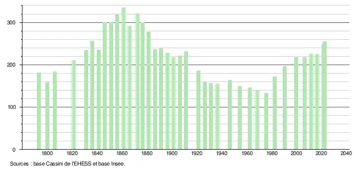 | L'évolution du nombre d'habitants est connue à travers les recensements de la population effectués dans la commune depuis 1793. Pour les communes de moins de 10 000 habitants, une enquête de recensement portant sur toute la population est réalisée tous les cinq ans, les populations de référence des années intermédiaires étant quant à elles estimées par interpolation ou extrapolation[18]. Pour la commune, le premier recensement exhaustif entrant dans le cadre du nouveau dispositif a été réalisé en 2006[19]. En 2022, la commune comptait 255 habitants[Note 4], en évolution de +13,33 % par rapport à 2016 (Hautes-Pyrénées : +1,59 %, France hors Mayotte : +2,11 %). |