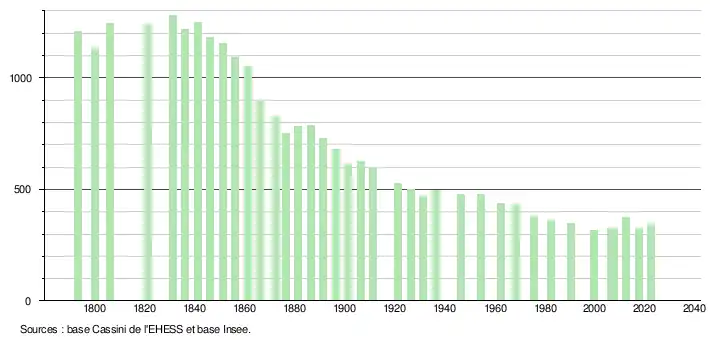 L'évolution du nombre d'habitants est connue à travers les recensements de la population effectués dans la commune depuis 1793. Pour les communes de moins de 10 000 habitants, une enquête de recensement portant sur toute la population est réalisée tous les cinq ans, les populations de référence des années intermédiaires étant quant à elles estimées par interpolation ou extrapolation[28]. Pour la commune, le premier recensement exhaustif entrant dans le cadre du nouveau dispositif a été réalisé en 2007[29].
