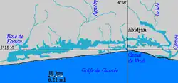 La lagune Ébrié, parfois appelée lagune Ahizi, est une lagune à eau saumâtre située en Côte d’Ivoire autour de laquelle est construite notamment la capitale Abidjan. Sa surface est d’environ 560 km2, avec une largeur maximale de 7 km, une profondeur moyenne de 4,8 m, une profondeur maximale de 20 m[1] et une longueur de 130 km (en direction est-ouest).
