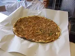 - ↑ Parfois aussi transcrit lahm b'ageen, lahm bi ajeen, lahm bi ajin ou encore lahem bi ajin.