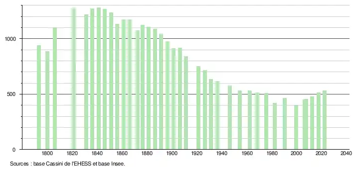 L'évolution du nombre d'habitants est connue à travers les recensements de la population effectués dans la commune depuis 1793. Pour les communes de moins de 10 000 habitants, une enquête de recensement portant sur toute la population est réalisée tous les cinq ans, les populations de référence des années intermédiaires étant quant à elles estimées par interpolation ou extrapolation[37]. Pour la commune, le premier recensement exhaustif entrant dans le cadre du nouveau dispositif a été réalisé en 2007[38].