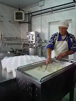 - En agriculture, une laiterie est une dépendance d'une ferme qui sert à entreposer le lait cru après la traite pour le vendre ou pour le transformer sur place ; elle est généralement contigüe à la salle de traite ou en est peu éloignée. Si la destination du lait est la cession, ce lait doit donc être collecté par un artisan ou par l'industrie agroalimentaire. Si la destination est la vente en production fermière, il sera transformé en beurre, en crèmes, en fromages, en yaourts par l'agriculteur producteur fermier. L'installation d'une laiterie doit satisfaire à certaines dispositions réglementaires notamment en ce qui concerne l'hygiène[1].