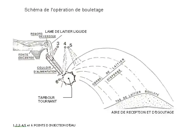 - Sur la machine de bouletage : injection d'eau dans le laitier en fusion pour provoquer par évaporation l'expansion et le refroidissement, elle accroît la viscosité du produit permettant de retenir les bulles de gaz formées au sein du laitier ;