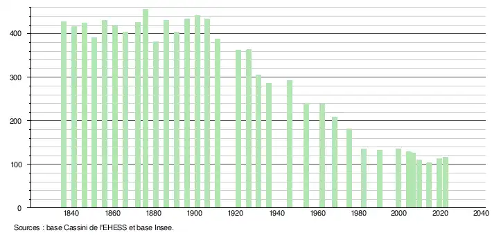 L'évolution du nombre d'habitants est connue à travers les recensements de la population effectués dans la commune depuis 1836. Pour les communes de moins de 10 000 habitants, une enquête de recensement portant sur toute la population est réalisée tous les cinq ans, les populations de référence des années intermédiaires étant quant à elles estimées par interpolation ou extrapolation[30]. Pour la commune, le premier recensement exhaustif entrant dans le cadre du nouveau dispositif a été réalisé en 2004[31].