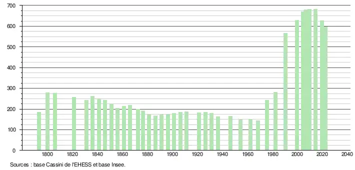 L'évolution du nombre d'habitants est connue à travers les recensements de la population effectués dans la commune depuis 1793. Pour les communes de moins de 10 000 habitants, une enquête de recensement portant sur toute la population est réalisée tous les cinq ans, les populations de référence des années intermédiaires étant quant à elles estimées par interpolation ou extrapolation[23]. Pour la commune, le premier recensement exhaustif entrant dans le cadre du nouveau dispositif a été réalisé en 2004[24].