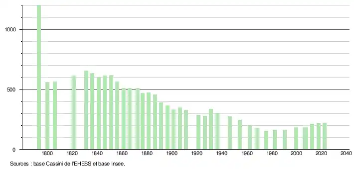 L'évolution du nombre d'habitants est connue à travers les recensements de la population effectués dans la commune depuis 1793. Pour les communes de moins de 10 000 habitants, une enquête de recensement portant sur toute la population est réalisée tous les cinq ans, les populations de référence des années intermédiaires étant quant à elles estimées par interpolation ou extrapolation[25]. Pour la commune, le premier recensement exhaustif entrant dans le cadre du nouveau dispositif a été réalisé en 2007[26].