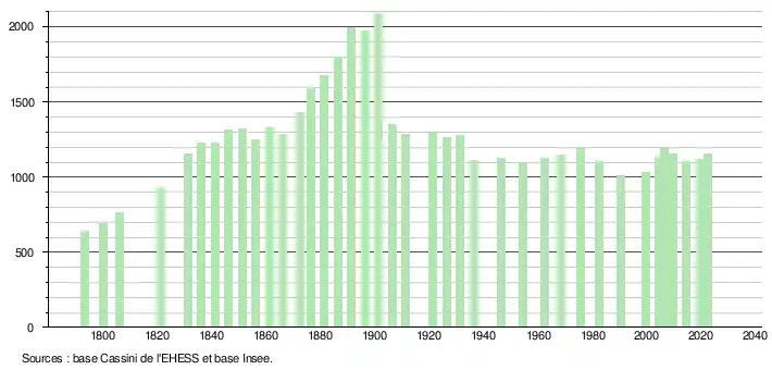L'évolution du nombre d'habitants est connue à travers les recensements de la population effectués dans la commune depuis 1793. Pour les communes de moins de 10 000 habitants, une enquête de recensement portant sur toute la population est réalisée tous les cinq ans, les populations de référence des années intermédiaires étant quant à elles estimées par interpolation ou extrapolation[17]. Pour la commune, le premier recensement exhaustif entrant dans le cadre du nouveau dispositif a été réalisé en 2004[18].
