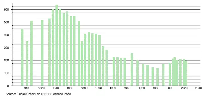 L'évolution du nombre d'habitants est connue à travers les recensements de la population effectués dans la commune depuis 1793. Pour les communes de moins de 10 000 habitants, une enquête de recensement portant sur toute la population est réalisée tous les cinq ans, les populations de référence des années intermédiaires étant quant à elles estimées par interpolation ou extrapolation[37]. Pour la commune, le premier recensement exhaustif entrant dans le cadre du nouveau dispositif a été réalisé en 2004[38].