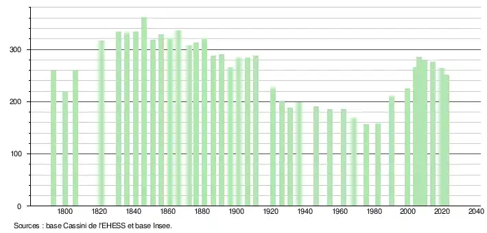 L'évolution du nombre d'habitants est connue à travers les recensements de la population effectués dans la commune depuis 1793. Pour les communes de moins de 10 000 habitants, une enquête de recensement portant sur toute la population est réalisée tous les cinq ans, les populations de référence des années intermédiaires étant quant à elles estimées par interpolation ou extrapolation[35]. Pour la commune, le premier recensement exhaustif entrant dans le cadre du nouveau dispositif a été réalisé en 2004[36].