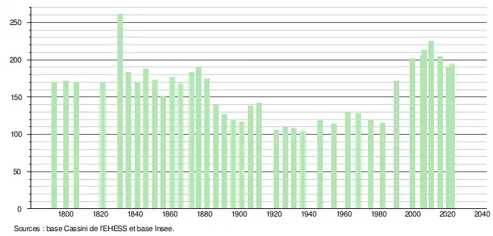 L'évolution du nombre d'habitants est connue à travers les recensements de la population effectués dans la commune depuis 1793. Pour les communes de moins de 10 000 habitants, une enquête de recensement portant sur toute la population est réalisée tous les cinq ans, les populations de référence des années intermédiaires étant quant à elles estimées par interpolation ou extrapolation[29]. Pour la commune, le premier recensement exhaustif entrant dans le cadre du nouveau dispositif a été réalisé en 2005[30].