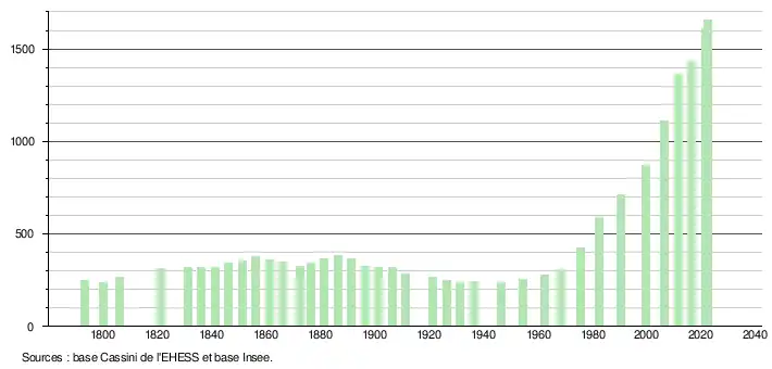 | L'évolution du nombre d'habitants est connue à travers les recensements de la population effectués dans la commune depuis 1793. Pour les communes de moins de 10 000 habitants, une enquête de recensement portant sur toute la population est réalisée tous les cinq ans, les populations de référence des années intermédiaires étant quant à elles estimées par interpolation ou extrapolation[28]. Pour la commune, le premier recensement exhaustif entrant dans le cadre du nouveau dispositif a été réalisé en 2006[29]. En 2022, la commune comptait 1 655 habitants[Note 3], en évolution de +15,65 % par rapport à 2016 (Haute-Garonne : +8,02 %, France hors Mayotte : +2,11 %). |