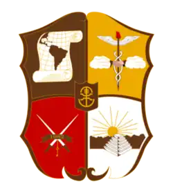 - Dans le quadrant brun supérieur gauche est représenté un parchemin avec une image de l'Amérique latine.