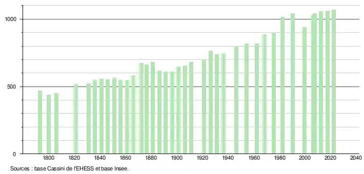 L'évolution du nombre d'habitants est connue à travers les recensements de la population effectués dans la commune depuis 1793. Pour les communes de moins de 10 000 habitants, une enquête de recensement portant sur toute la population est réalisée tous les cinq ans, les populations de référence des années intermédiaires étant quant à elles estimées par interpolation ou extrapolation[28]. Pour la commune, le premier recensement exhaustif entrant dans le cadre du nouveau dispositif a été réalisé en 2007[29].