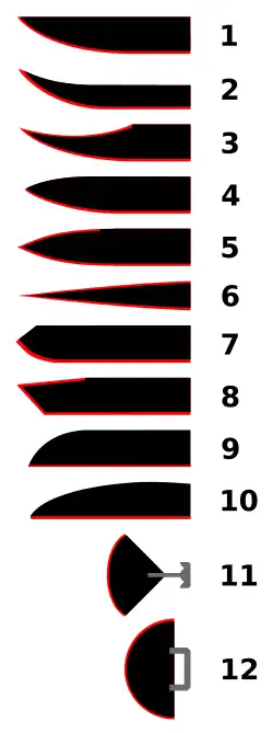 - une lame de type clip-point. Différentes variations autour du modèle du dessin existent, au trait souvent moins marqué pour les couteaux, ce schéma rappelant plutôt la lame de certains types de sabres, qui suivent mieux cette modélisation. Le couteau Bowie est un exemple assez connu de ce type de couteaux ;