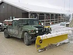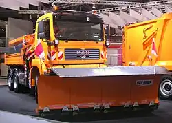 Cet outil est fixé à l'avant du véhicule de déneigement et est poussé par celui-ci. Il est constitué d'un châssis généralement en acier, d'un corps de lame en acier ou en plastique et d'une lame d'usure en acier ou en matière synthétique.