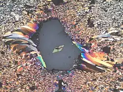 Lame ultra-mince d'une roche carbonatée. Les couleurs irisées (couleurs d'interférence) sont un artéfact dû à un polissage irrégulier.