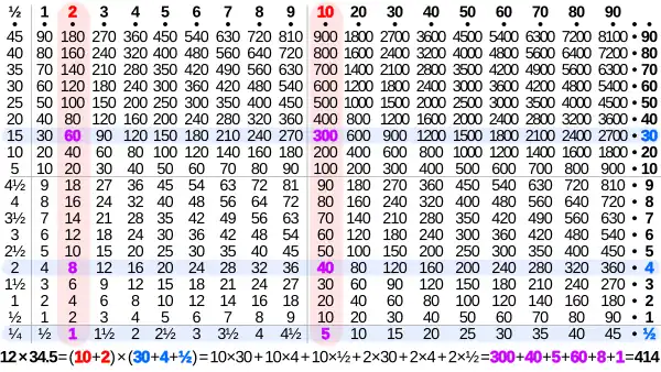 Le 7 janvier 2014, la revue Nature a annoncé que sur certaines de ces lamelles, datées d'environ 305 av. J.-C., se trouve le plus vieil exemple de table de multiplication en base dix du monde découvert à ce jour, donnant tous les produits entre eux des entiers de 1 à 9, des dizaines de 10 à 90, et du nombre 1/2[3].