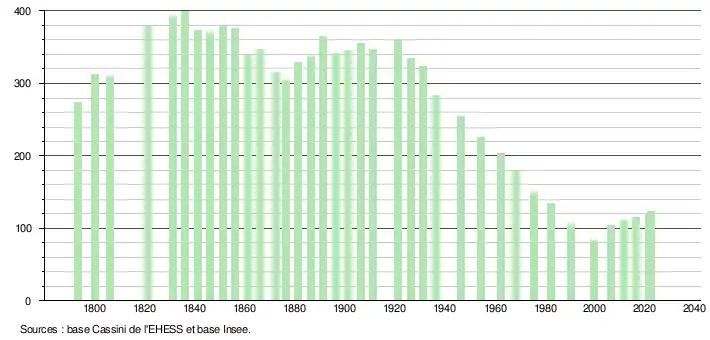 | L'évolution du nombre d'habitants est connue à travers les recensements de la population effectués dans la commune depuis 1793. Pour les communes de moins de 10 000 habitants, une enquête de recensement portant sur toute la population est réalisée tous les cinq ans, les populations de référence des années intermédiaires étant quant à elles estimées par interpolation ou extrapolation[26]. Pour la commune, le premier recensement exhaustif entrant dans le cadre du nouveau dispositif a été réalisé en 2006[27]. En 2022, la commune comptait 124 habitants[Note 1], en évolution de +7,83 % par rapport à 2016 (Corrèze : −0,59 %, France hors Mayotte : +2,11 %). |