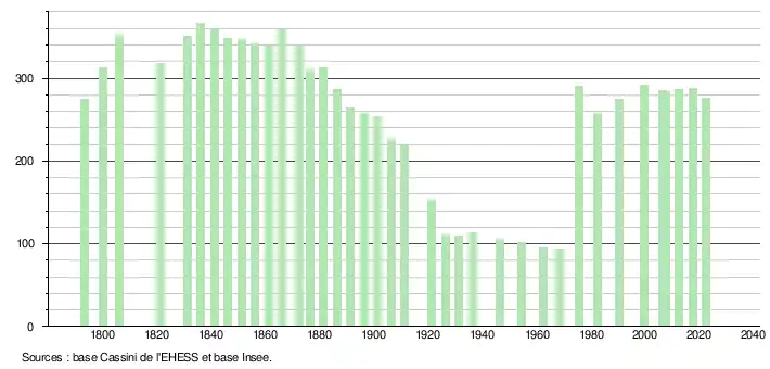 L'évolution du nombre d'habitants est connue à travers les recensements de la population effectués dans la commune depuis 1793. Pour les communes de moins de 10 000 habitants, une enquête de recensement portant sur toute la population est réalisée tous les cinq ans, les populations de référence des années intermédiaires étant quant à elles estimées par interpolation ou extrapolation[27]. Pour la commune, le premier recensement exhaustif entrant dans le cadre du nouveau dispositif a été réalisé en 2007[28].